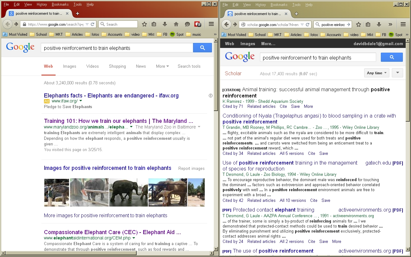 Here’s a side-by-side comparison of the search results delivered by Google and Google Scholar for an identical simple search request: positive reinforcement to train elephants.