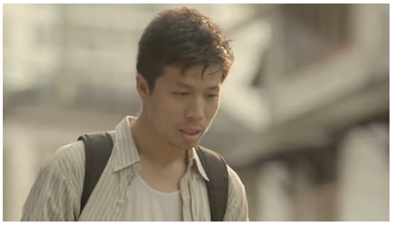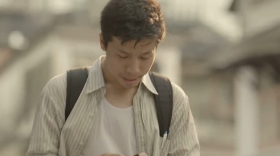 A young Asian man, probably outdoors in a city, is dressed casually and wears a backpack. He is either not well shaved or has deliberately chosen the unshaven look for fashion’s sake. His hairstyle is neat but casual and his open shirt and undershirt are clean, so the impression we get is that he is not poor or homeless but that he chooses to dress for an informal effect. He carries a pen in his pocket: industrious or at least prepared. He is looking down, either to see the curb, or something on the sidewalk, or at least something below eye level, perhaps in his hand.