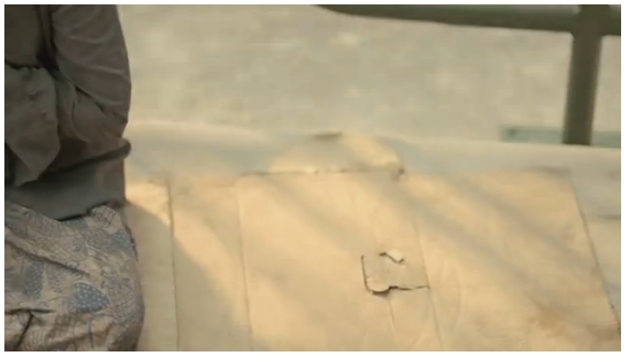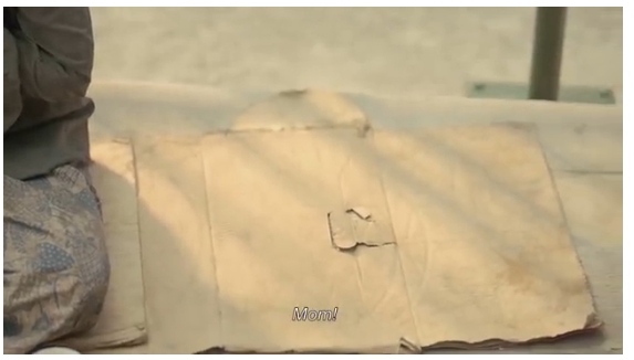 The camera pans down to reveal that she is in fact sitting on the ground, more specifically on a piece of cardboard torn from a shipping carton as we can tell from the torn die-cut handle. In other words, she’s sitting on some trash she brought here for this purpose.The cardboard is wider than it needs to be for her. Next to her is what we might call, an “empty seat.” Is she perhaps waiting for him to join her? Or has she lost someone? Is it possible he has always given her money (the wallet? the sure steps in her direction?) and that her being alone is surprising or disturbing?
