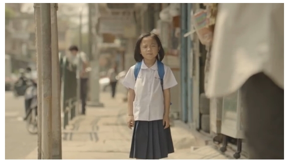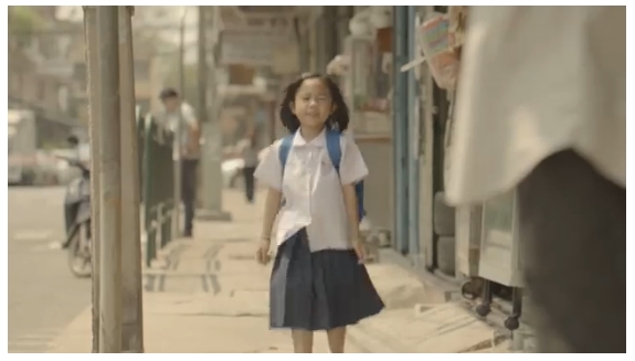 It’s a schoolgirl in an unmistakable schoolgirl uniform. The bit of stitching above the pockets is probably the name of the school. Like the man and woman, she’s Asian, a girl of six or seven maybe? An early elementary school child.